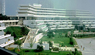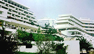 Zobaczyliśmy wielki kompleks supernowoczesnych 7-9 kondygnacyjnych hoteli, pobudowanych tarasami na wysokim stoku brzegu morskiego. Wszystkie olśniewająco białe, połączone wzajemnie pergolami i galeriami, w głębi których usytuowane były bary, kawiarnie, sklepy, placyki z rzeźbami i fontannami. U stóp hoteli, wśród bujnej zieleni, otwarte baseny kąpielowe o fantazyjnych kształtach, a przed nimi szeroka piaszczysta plaża i morze ze swymi falami i błękitem. Wszystko zapełnione tłumem kąpiących się i plażujących turystów. Z całą pewnością nie było wśród nich Polaków.